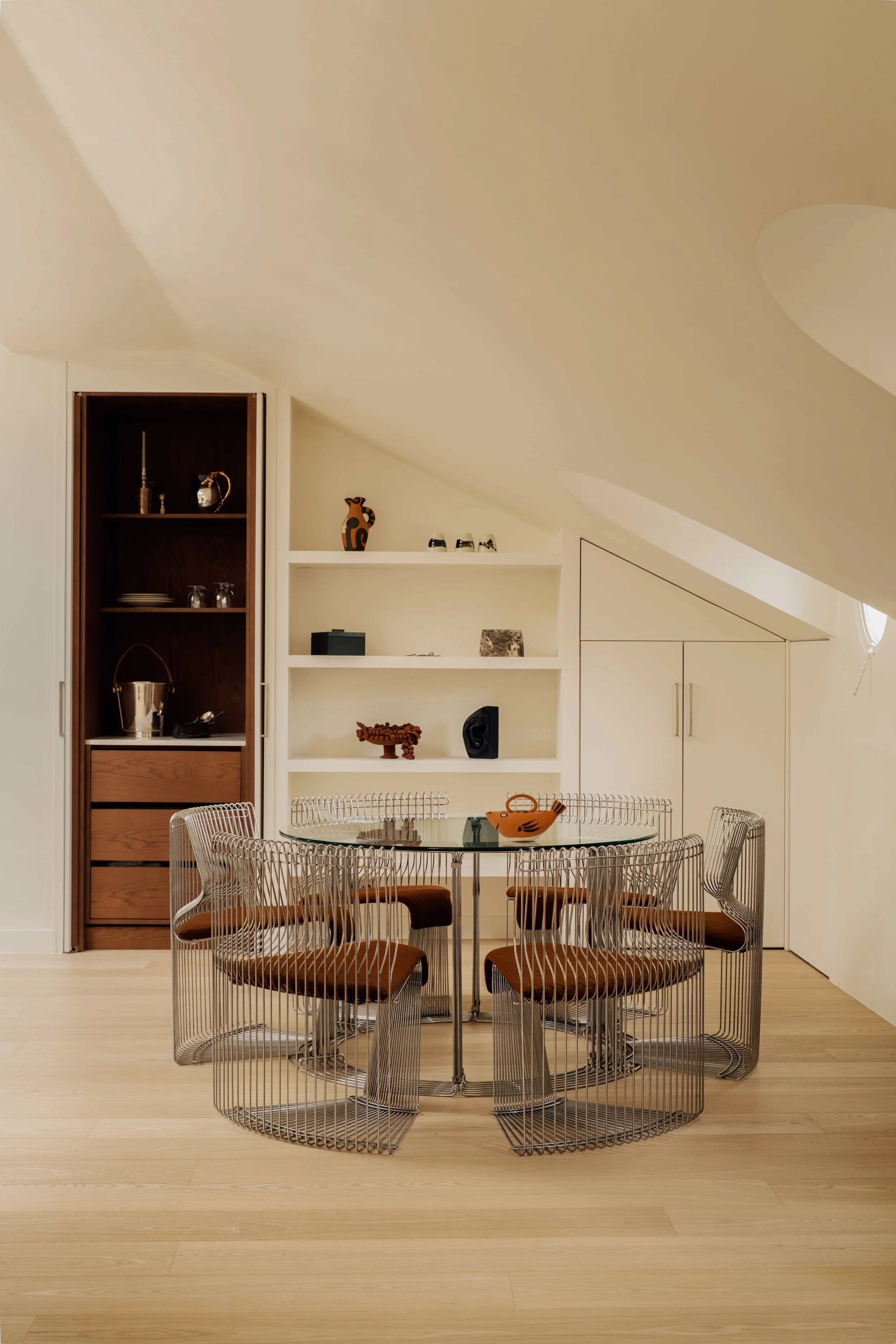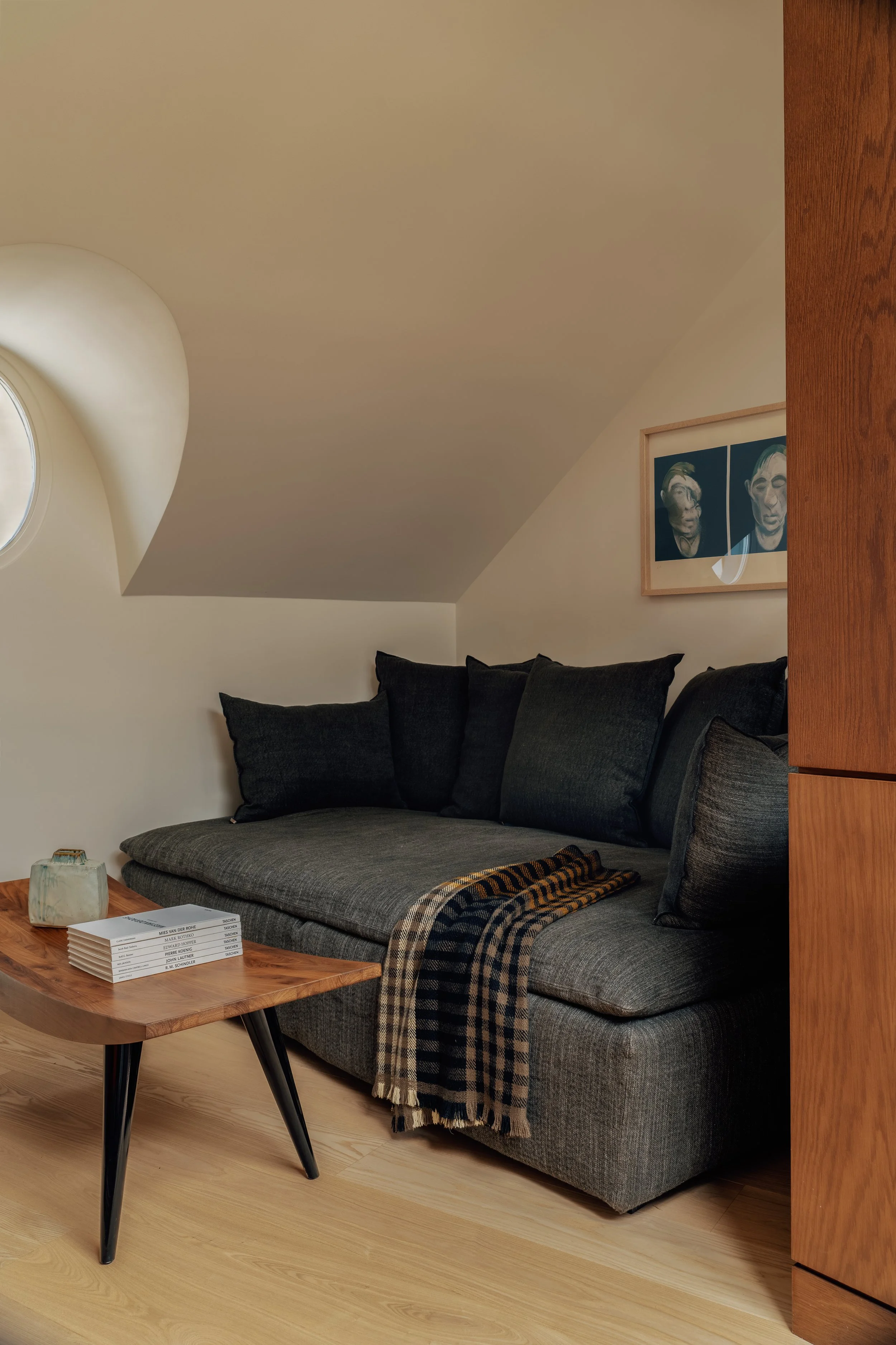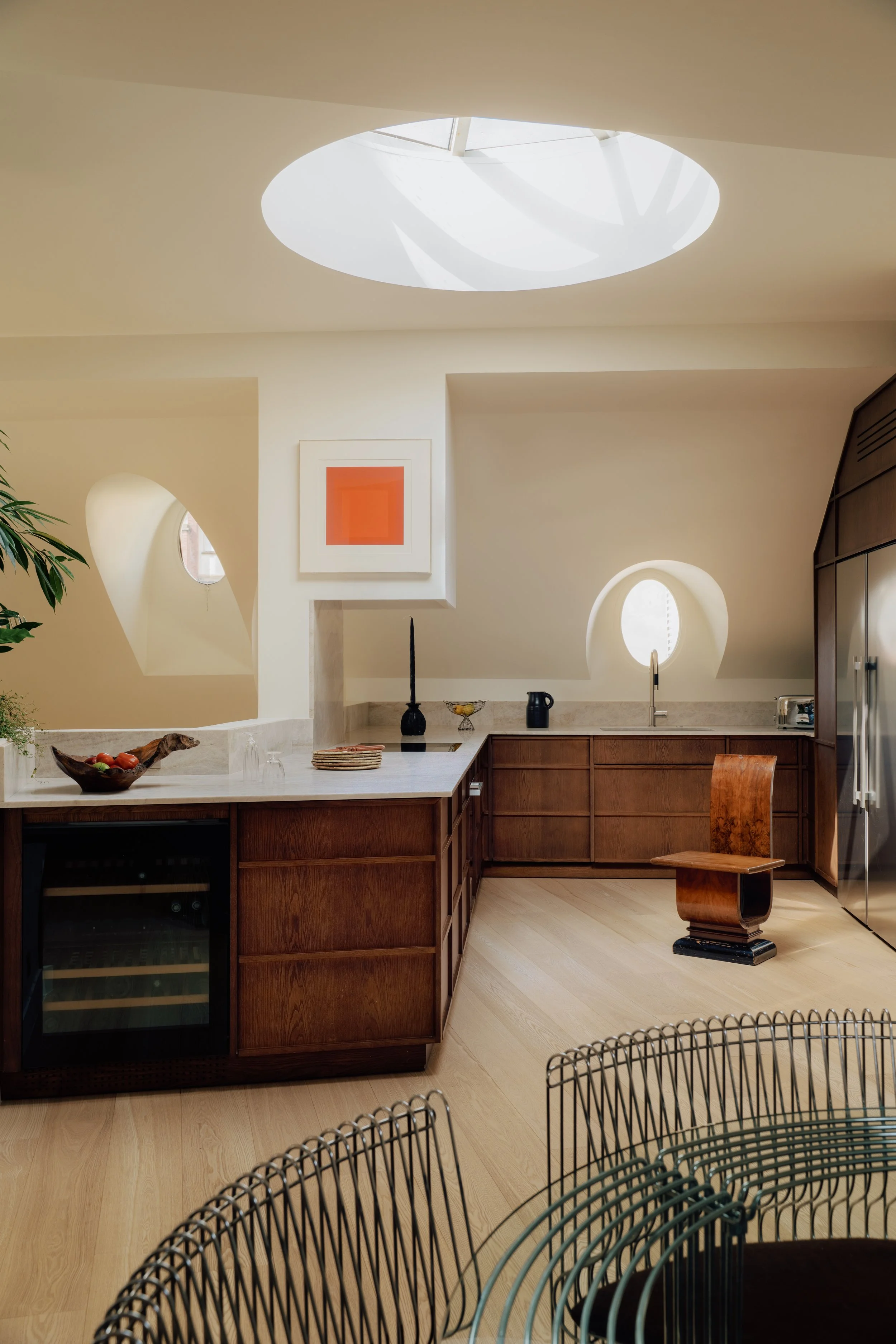 À l’étage, les pièces de vie s’organisent autour d’un salon aux lignes presque circulaires, prolongé par une cuisine ouverte. La lumière naturelle structure l’espace, renforcée par des oculus en toiture qui apportent une dimension singulière.