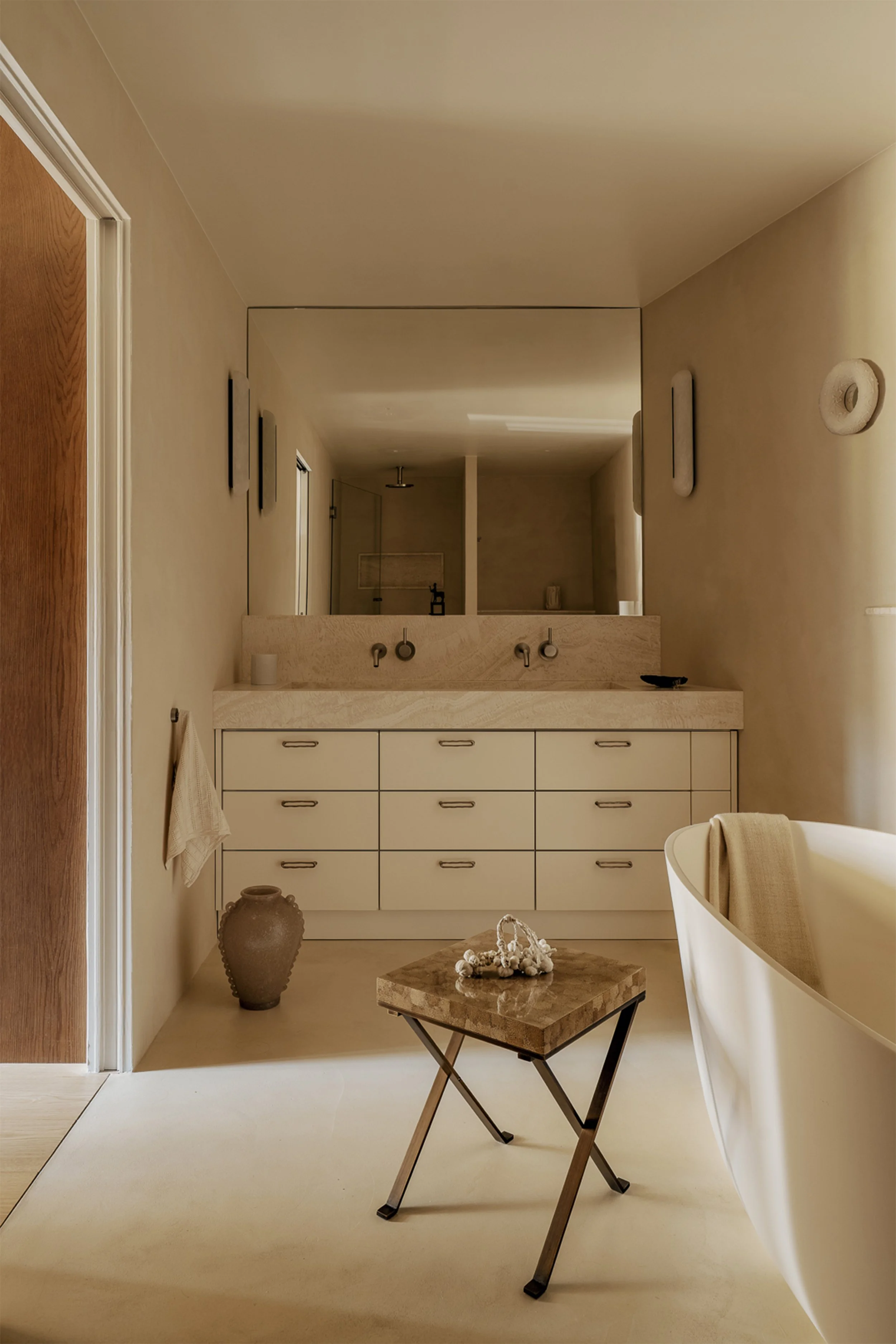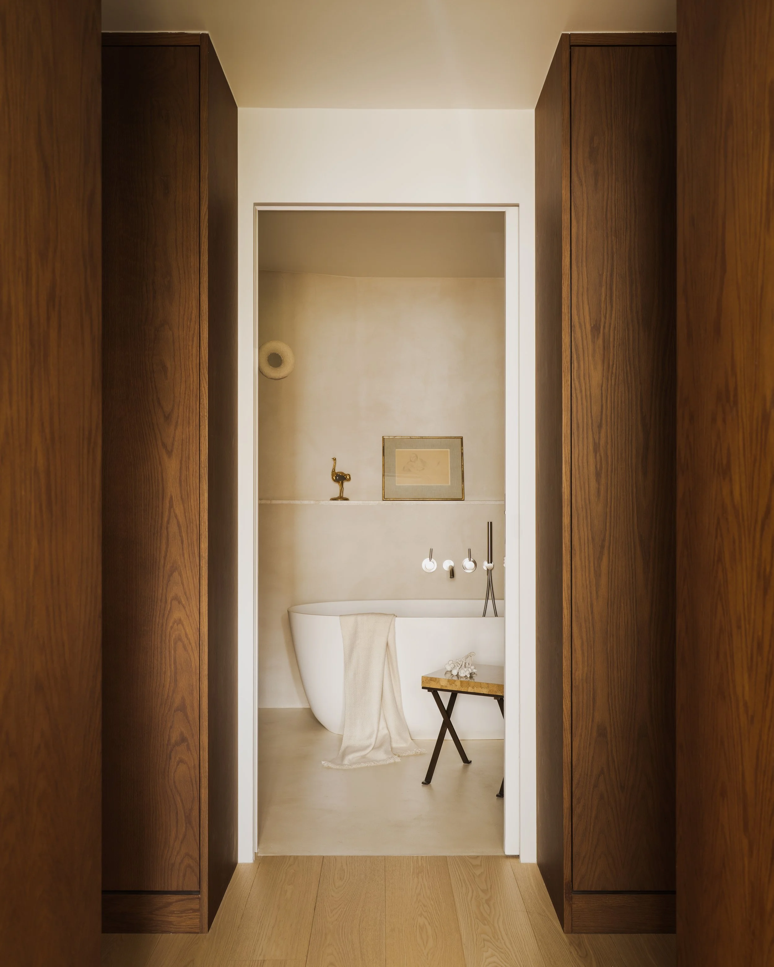 En rez-de-chaussée, les espaces nuit sont pensés comme un retrait, tourné vers le calme. Bois clair, pierre et enduits composent une atmosphère maîtrisée.